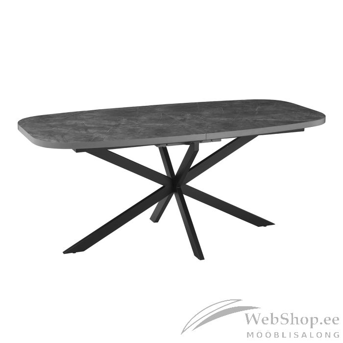 Pikendatav söögilaud RAMONA 180/220x90xH75cm, betoon. Lauaplaat: MDF betooni dekoor. Laua ristjalad on valmistatud metallist ja viimistletud musta pulbervärviga.