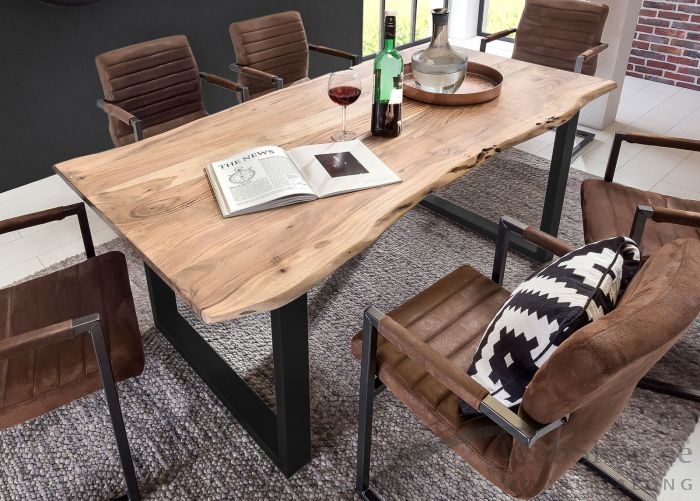 Akaatsiapuidust lauaplaadiga söögilaud. Viimistlus: naturaalne. Laual on antiikmusta värvi metallist jalad. Laual on kumerad ääred. Iga toode on originaalne ja võib erineda pildil olevast, sest on naturaalsest puidust. Laud on toodetud Indias.