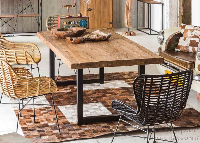 Taaskasutatud tiikpuust lauaplaadiga söögilaud. Viimistlus: naturaalne. Jalad on metallist, antiikmustad.