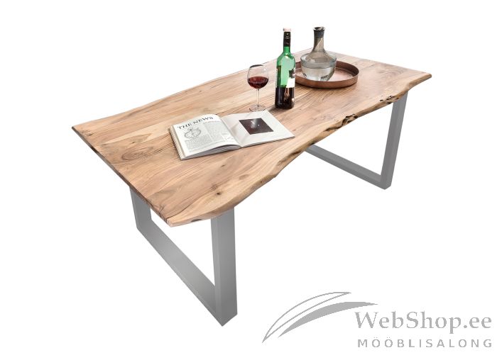 Akaatsiapuidust lauaplaadiga söögilaud. Viimistlus: naturaalne, lakitud. Jalad on antiikhõbedat värvi metallist. Iga toode on originaalne ja võib erineda pildil olevast, sest on naturaalsest puidust.