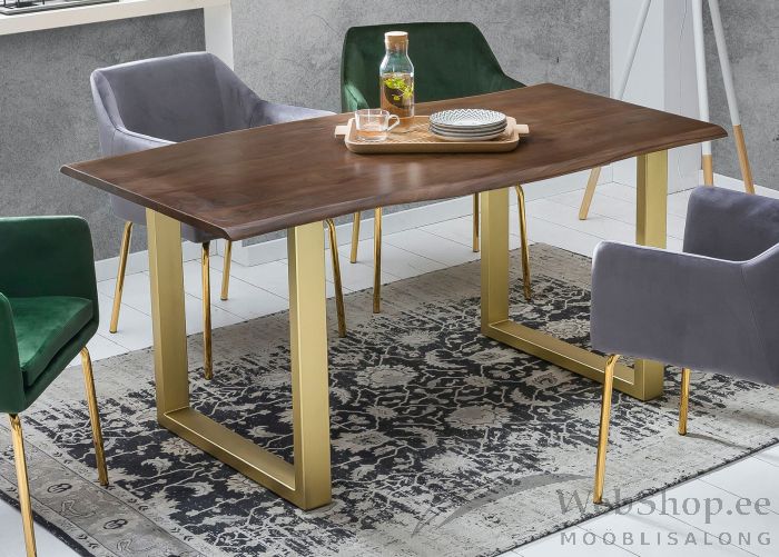 Akaatisapuidust lauaplaadiga ja metallist jalgadega söögilaud. Lauaplaat on värvitud pähkli tooni. Jalad on messingu tooni. Iga toode on originaalne ja võib erineda pildil olevast, sest on naturaalsest puidust.
