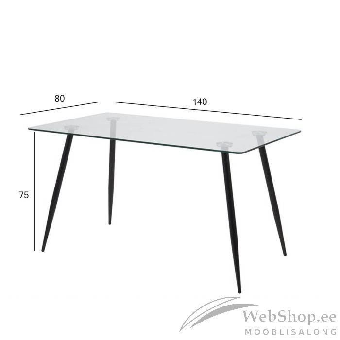 Söögilaud on nii visuaalselt atraktiivne kui ka vastupidav. Ajatu disainiga laud on valmistatud metallist ja klaasist. Materjalide valik tagab minimaalse hoolduse, lauda on lihtne puhastada. Laual on peened nurga all olevad jalad. Lauaplaat: 10mm klaas, jalad: musta värvi metall. Mõõdud 140x80xH75cm.