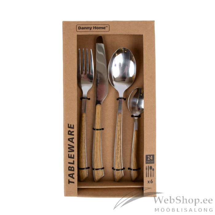 Söögiriistad DUNE 24-osa, metallist, puidu imitatsiooniga käepidemel. 6 nuga 23cm, 6 kahvlit 20,5cm, 6 supilusikat 20,7cm, 6 magustoidulusikat 14,5cm.