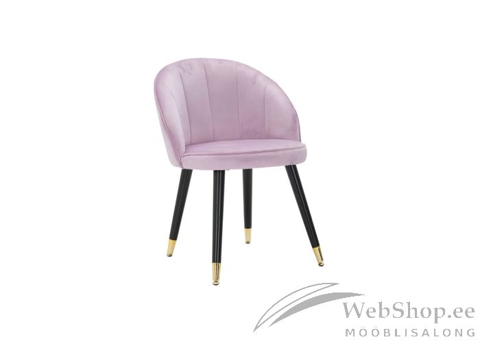 Stiilne roosat värvi tekstiilist kattega söögitool. Tooli jalad on musta värvi puidust. Istme pehmenduseks poroloon. Kuldset tooni metallist detailid.