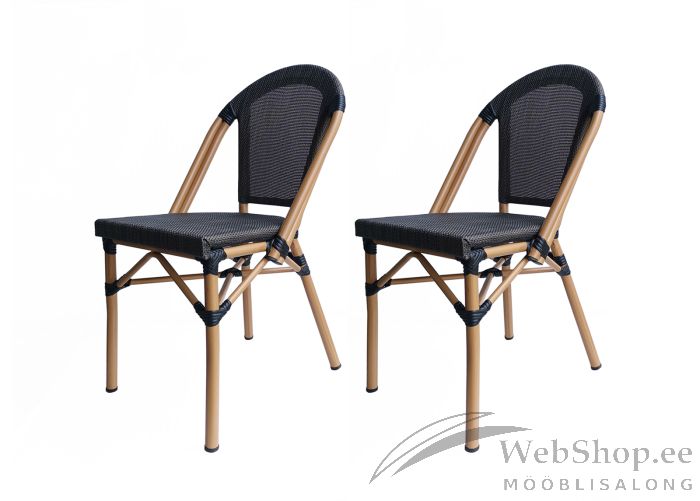 Rotangi välimusega söögitoolide komplekt. Toolid on valmistatud alumiiniumist ja tumehallist tekstiilist. Komplekti kuulub 2 tooli. Niiskuskindel.