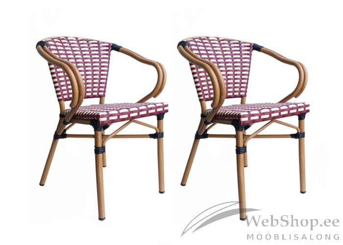 Rotangi välimusega söögitoolide komplekt. Toolid on valmistatud alumiiniumist ja polürotangist. Komplekti kuulub 2 tooli. Niiskuskindel.