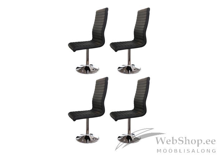 Musta värvi kunstnahast söögitoolide komplekt. Komplekti kuulub 4 tooli. Pehmenduseks poroloon. Jalad on kroomitud metallist. Tool on pöörlev.