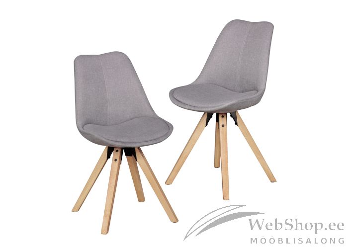 Kummipuust jalgadega söögitoolide komplekt. Komplekti kuulub 2 tekstiilist kattega tooli. Viimistlus: hall. Tooli pehmenduseks on poroloon.