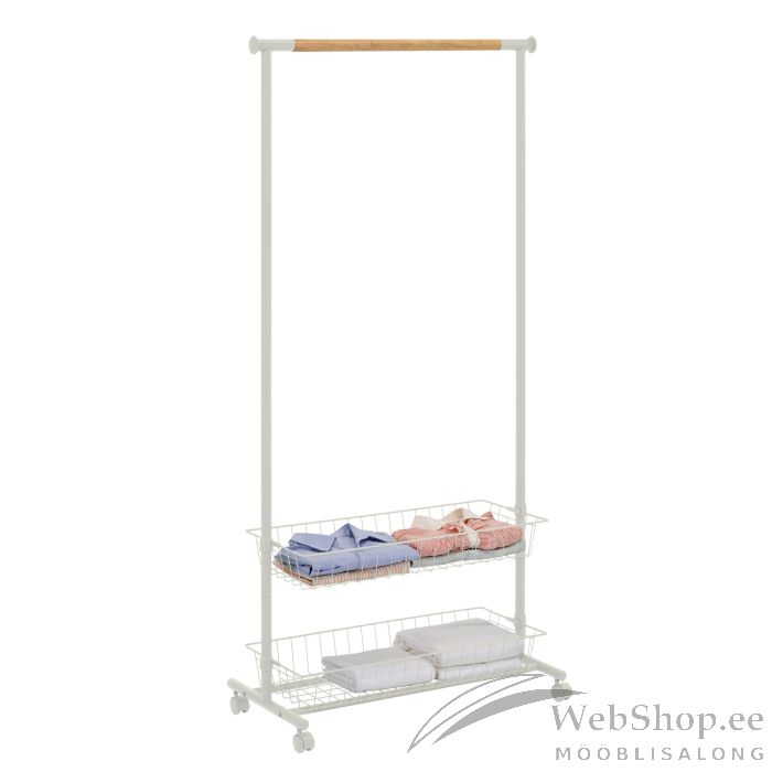 Stange BREN valge. Praktiline stange on ideaalne rõivaste mitmekülgseks hoiustamiseks. Stange ülemises osas on puidust naturaalses toonis pulk, millele riided riputada. Toote alumises osas on kaks traatkorvi vajaliku hoiustamiseks. Lisaks on stangel rattad, mis võimaldavad seda lihtsasti liigutada. Terasraam ja -korvid on kaetud valge pulbervärviga. Stange mõõdud on 80x36xH165cm.