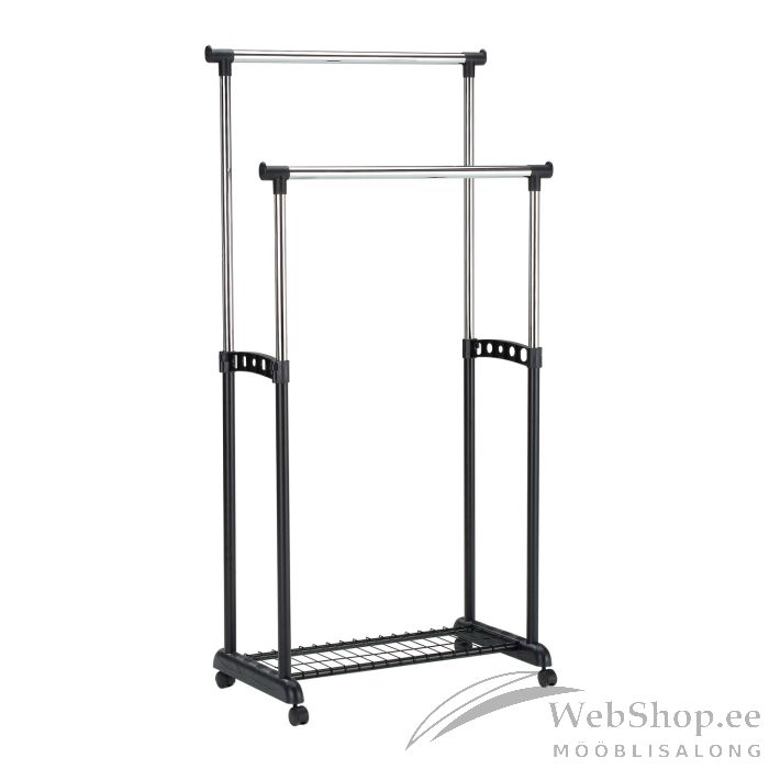 Stange FRY 2-riputustoruga 83x43xH93,5-168cm, must/ kroom. Ratastel liikuv, reguleeritava kõrgusega stange on lihtne ja praktiline lahendus riiete ja jalanõude organiseerimiseks. Stange alusraam on valmistatud mustast plastikust, küljepostid ja riputustorud on valmistatud kroomitud terasest. Stange alumises osas on jalatsirest. Kandevõime 2x15kg.