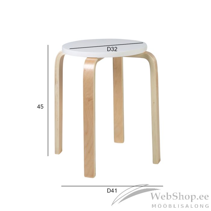 Taburet SIXTY-1 D41xH45cm valge. Klassikaline virnastatav taburet. Materjal: liimpuit kasespooniga. Istme läbimõõt 32cm paksus 2cm. Jalg: laius 4cm paksus 2cm.