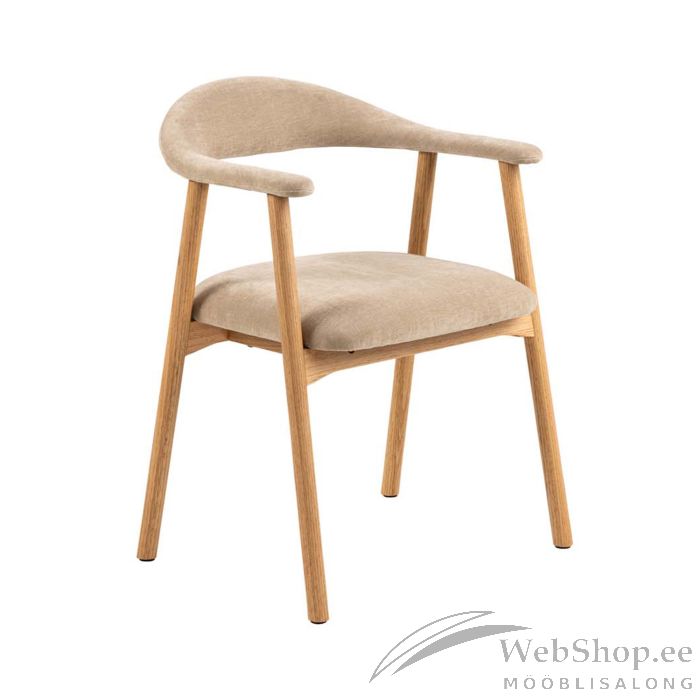 Tool on kaasaegse põhjamaise hõnguga. Seda iseloomustab kerge vorm ja puhas esteetika. Toolil on käetoed ja avatud seljatugi. Õliga töödeldud raam toob ruumi soojust ja loob õdusa õhkkonna. Elegantsust lisab beeži värvi šenillilaadse kangaga kaetud pehme iste. Kangas: 100% polüester, Martindale > 40 000. Jalad: lakitud tamm. Toote mõõdud on 56x54xH75,5cm.