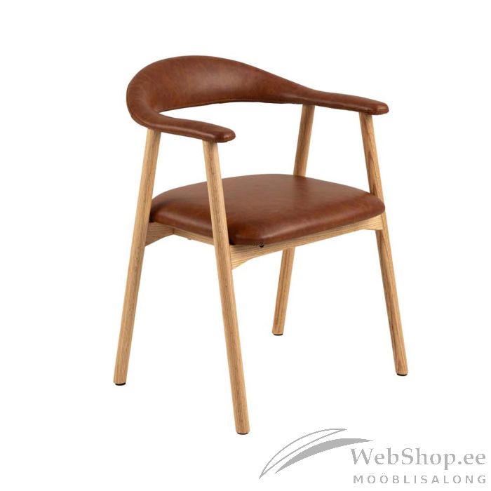 Tooli disain on kaasaegne ja põhjamaise hõnguga. Toolil on käetoed ja avatud seljatoe osa. Õliga töödeldud raam lisab ruumi soojust ja loob kutsuva õhkkonna. Iste on kaetud brändivärvi kunstnahast kangaga. Mõõdud on 56x54xH75,5cm. HOOLDUS: pühkige pind seebiveest kuivaks väänatud lapiga või PU (polüuretaan) pindadele mõeldud vahendiga ja pühkige kuivaks. Kasutage ainult PH neutraalseid (7,0) puhastusvahendeid. Ärge asetage mööblit otsese päikesevalguse kätte. Alus: Kõik plekid tuleb koheselt eemaldada niiske lapiga. Kasutage seebiveest kuivaks väänatud lappi.