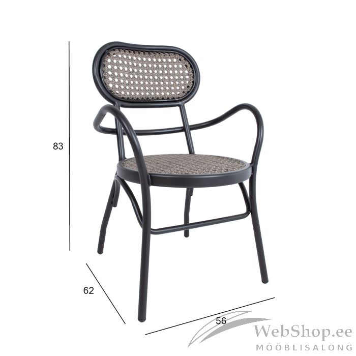 Tool BOLGHERI must. Paigutades aiatoolid rõdule, terrassile või aeda, saab kujundada hubase istumisala, kus päeval kaunist ilma nautida või õdusaid õhtuid veeta. Valides juurde sobiva laua ja kombineerides sarnaseid tooteid, on võimalik luua endale meelepärane ja harmooniline komplekt. Tooli iste ja seljatugi on kaetud halli plastikpunutisega. Tooli raam on valmistatud mustast pulbervärvitud alumiiniumist. Metalltoru mõõdud on D25x1,8mm. Tooli mõõdud on 56x62xH83cm.