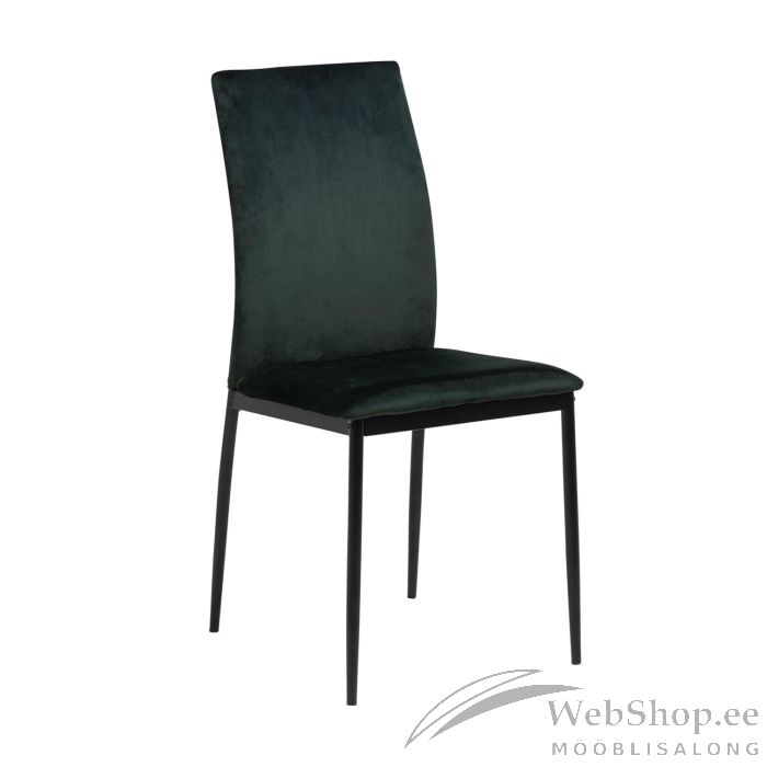 Söögitooli disain on minimalistlik ja elegantsete joontega. Kitsenevad metalljalad on pulbervärvitud viimistlusega. Tool lisab einestamisalasse elegantset rafineeritust. Kattematerjal: kangas, tumeroheline; alus: metall, pulbervärvitud, must. Kaalupiirang on 110kg. Mõõdud on 43,5x53xH92cm.