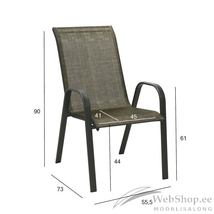 Tool DUBLIN, kuldpruun. Tooli textiline iste laseb hästi õhku läbi, kuivab kiiresti ja seda on lihtne puhastada. Tooli raam ja jalad on valmistatud terasest ja viimistletud tumepruuni pulbervärviga. Toolid on virnastatavad ning nende hoiustamine on lihtne ja ruumi säästev. Tooli üldmõõdud on 55,5x73xH90cm. Istme laius 45cm, istme sügavus 41cm, istme kõrgus 44cm. Seljatoe kõrgus 57cm. Käetoe kõrgus maast 61cm. Kaalupiirang 100kg.