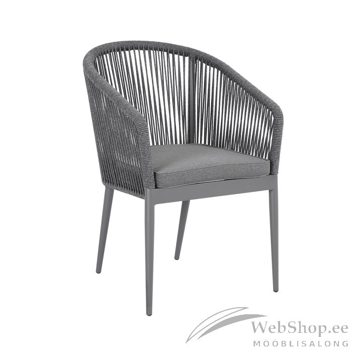 Tool ECCO, hall. Tooli raam ja jalad on valmistatud alumiiniumist ja viimistletud halli pulbervärviga. Tooli selja- ja käetoed on kaetud nöörpunutisega. Istmepadi kuulub komplekti. Padjakate on valmistatud polüesterkangast. Padja mõõdud 45x42x5cm. Istmepõhi on toestatud alumiiniumliistudega. Tooli mõõdud on 57x65xH81cm, istmekõrgus 44cm. Kaalupiirang 100kg. Toolid on virnastatavad ning nende hoiustamine on lihtne ja ruumi säästev. Toode on muutlikes ilmastikutingimustes vastupidav ja lihtsalt hooldatav. HOIUSTAMINE: suvehooaja lõppedes soovitame aiamööblit hoiustada siseruumides. Puhastage ja kuivatage mööbel enne hoiule panekut. Kasutage hoiustamiseks kuiva ning hea ventilatsiooniga ruumi.
