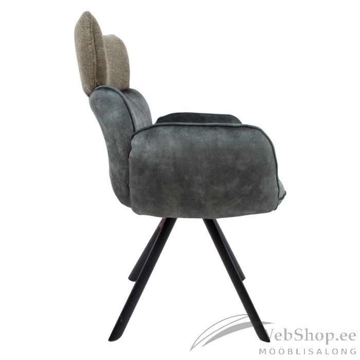 Tool EDDY käetugedega 63x55xH89cm, roheline samet. Söögitooli mugava vormiga iste ja käetoed on kergelt polsterdatud ja kaetud polüesterkangaga. Kasutatud on toon-toonis, kuid erineva pinna struktuuriga samet kangaid. Pulbervärvitud mustad metallist jalad. Tooli istmekõrgus 48cm, istme laius 45cm, istme sügavus 42cm. Seljatoe kõrgus 47cm. Käetoe kõrgus maast 64cm. Kaalupiirang 120kg.