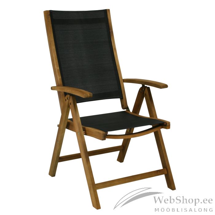 Tool FUTURE 57x69xH107cm, must. Reguleeritava seljatoega kokkupandav aiatool on mugav ja praktiline valik. Tooli raam on valmistatud akaatsia puidust ja viimistletud tiikpuu toonis puidukaitseõliga. Must textilene iste laseb hästi õhku läbi ja kuivavad kiiresti ja on lihtsalt hooldatav. Seljatoe reguleerimiseks tõstke käetoed üles, valige sobiv seljatoe asend ja fikseerige käetoed. Võimalik on valida 7 erineva positsiooni vahel. Kokkupanduna on tooli lihtne hoiustada ja teisaldada. Tooli mõõdud kokkupanduna 57x85x23cm. Istme laius 46cm, istme sügavus 46,5cm, istme kõrgus 43cm. Seljatoe kõrgus 69cm, käetoe kõrgus maast 63cm. Kaalupiirang 100kg. HOOLDUS: puhastage mööblit regulaarselt, kaitske liigniiskuse ja UV kiirguse eest. Kerge lihvimine korra aastas on piisav värskenduskuur puidust pindadele jälle uue näo andmiseks. HOIUSTAMINE: suvehooaja lõppedes soovitame aiamööblit hoiustada siseruumides. Puhastage ja kuivatage mööbel enne hoiule panekut. Kasutage hoiustamiseks kuiva ning hea ventilatsiooniga ruumi.