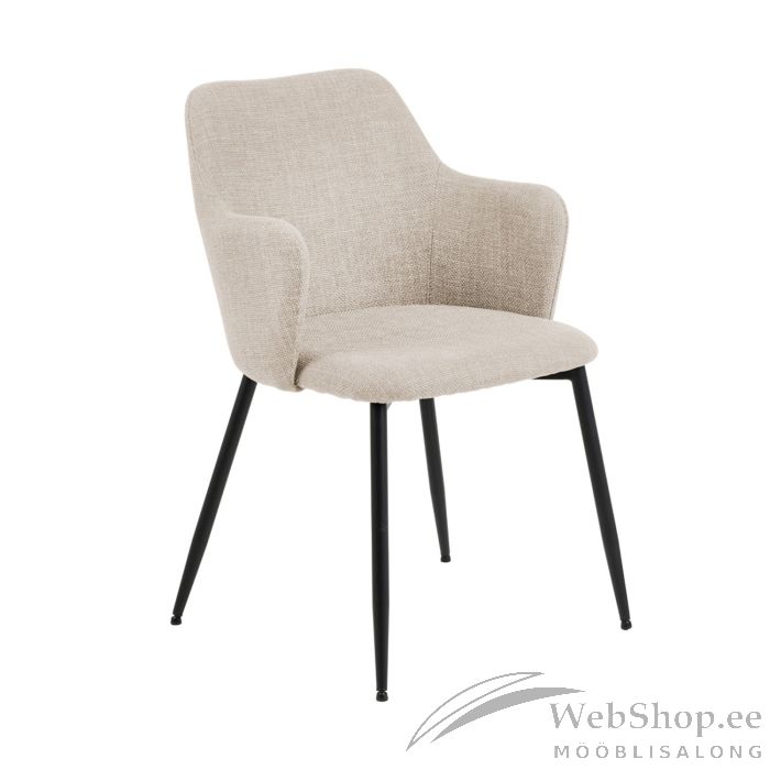 Söögitool muudab interjööri isikupäraseks. Nurga all olevad käetoed annavad toolile iseloomuliku ilme. Metalljalad pakuvad piisavalt stabiilsust, et saaksite nautida eineid mugavalt. Kangast kate on lukuga. Jalad: mattmust pulbervärvitud metall. Mõõdud on 55x58,5xH84,5cm. HOOLDUS: Hooldus piirdub tolmuimejaga ja plekieemaldamisega. Plekkide eemaldamisel tuleb olla ettevaatlik. Katsetage plekieemaldajaid esmalt vähem nähtaval alal ja tegutsege vastavalt tulemusele. Ärge kunagi kasutage lahusteid. Ärge asetage mööblit otsese päikesevalguse kätte. Alus: Kasutage igapäevaseks puhastamiseks seebiveest kuivaks väänatud lappi. Rooste vältimiseks pühkige pind lapiga kuivaks. Ärge hõõruge pinda kõvade esemetega.
