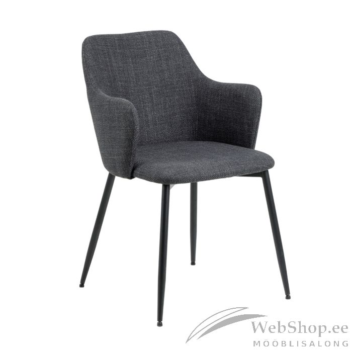Söögitool muudab interjööri isikupäraseks. Nurga all olevad käetoed annavad toolile iseloomuliku ilme. Metalljalad pakuvad piisavalt stabiilsust, et saaksite nautida eineid mugavalt. Kangast kate on lukuga. Jalad: mattmust pulbervärvitud metall. Mõõdud on 55x58,5xH84,5cm. HOOLDUS: Hooldus piirdub tolmuimejaga ja plekieemaldamisega. Plekkide eemaldamisel tuleb olla ettevaatlik. Katsetage plekieemaldajaid esmalt vähem nähtaval alal ja tegutsege vastavalt tulemusele. Ärge kunagi kasutage lahusteid. Ärge asetage mööblit otsese päikesevalguse kätte. Alus: Kasutage igapäevaseks puhastamiseks seebiveest kuivaks väänatud lappi. Rooste vältimiseks pühkige pind lapiga kuivaks. Ärge hõõruge pinda kõvade esemetega.