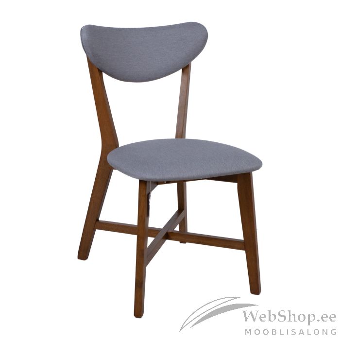 Tool JESPER hall. Tooli kergelt polsterdatud iste on kaetud halli polüesterkangaga. Tooli jalad ja raam on valmistatud kummipuust ja viimistletud pähkli toonis lakiga. Tooli üldmõõdud on 44x56x79,5cm. Istme kõrgus 45,5cm. Kaalupiirang 100kg.