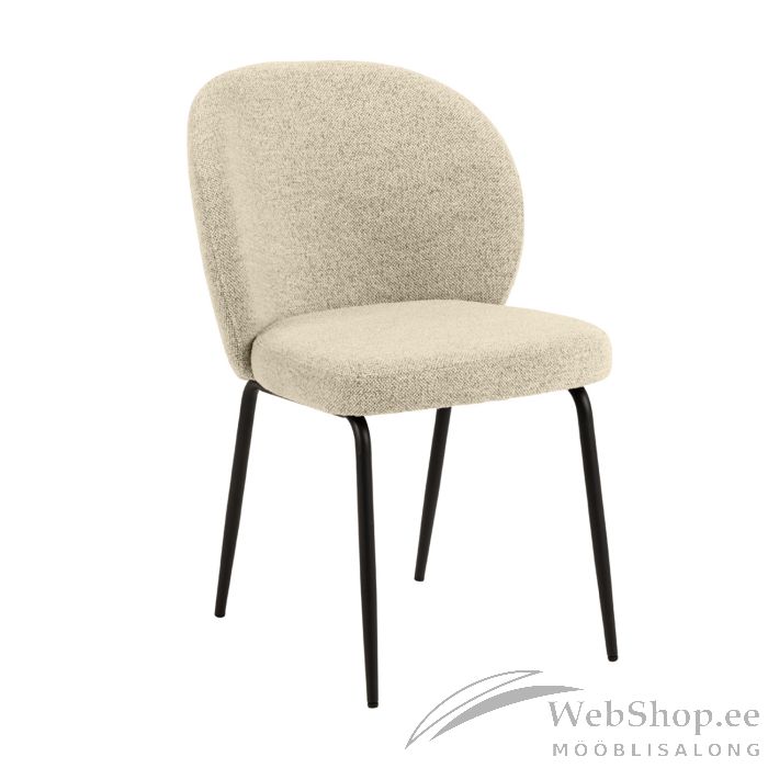 Muutke oma söögituba veelgi elegantsemaks. Bukleekangas lisab toolile moodsa välimuse. Kangast kate on lukuga. Ümar seljaosa toetab ja muudab istumise mugavamaks. Jalad: mattmust pulbervärvitud metall. Mõõdud on 47x59xH82cm. HOOLDUS: Hooldus piirdub tolmuimejaga ja plekieemaldamisega. Plekkide eemaldamisel tuleb olla ettevaatlik. Katsetage plekieemaldajaid esmalt vähem nähtaval alal ja tegutsege vastavalt tulemusele. Ärge kunagi kasutage lahusteid. Ärge asetage mööblit otsese päikesevalguse kätte. Alus: Kasutage igapäevaseks puhastamiseks seebiveest kuivaks väänatud lappi. Rooste vältimiseks pühkige pind kuivaks. Ärge hõõruge pinda kõvade esemetega.