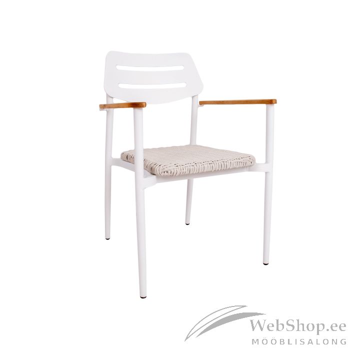 Tool WALES valge. Paigutades aiatoolid rõdule, terrassile või aeda, saab kujundada hubase istumisala, kus päeval kaunist ilma nautida või õdusaid õhtuid veeta. Valides juurde sobiva laua, on võimalik luua endale meelepärane ja harmooniline komplekt. Tooli iste on kaetud beeži plastikpunutisega. Käetoed on valmistatud naturaalsetest tiikpuidu liistudest. Tooli raam ja seljatugi on valget värvi alumiiniumist. Metalltoru mõõdud on D28x1,2mm. Tool on virnastatav, mis muudab selle hoiustamise hõlpsamaks. Tooli mõõdud on 56x60xH82cm.