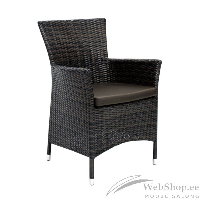 Tool WICKER-1 tumepruun. Paigutades aiatoolid rõdule, terrassile või aeda, saab kujundada hubase istumisala, kus päeval kaunist ilma nautida või õdusaid õhtuid veeta. Kombineerides sarnast tooni tooteid, on võimalik luua endale meelepärane ja harmooniline komplekt. Tooli terasraami katab tumepruun plastikpunutis. Punutise värvikood on ZF8974. Mugav ja pehme padi kuulub toote juurde, mis on kaetud polüester PVC kangaga. Toode on muutlikes ilmastikutingimustes vastupidav. Tooli kaalupiirang on 120kg ning mõõdud on 61x58xH86cm.