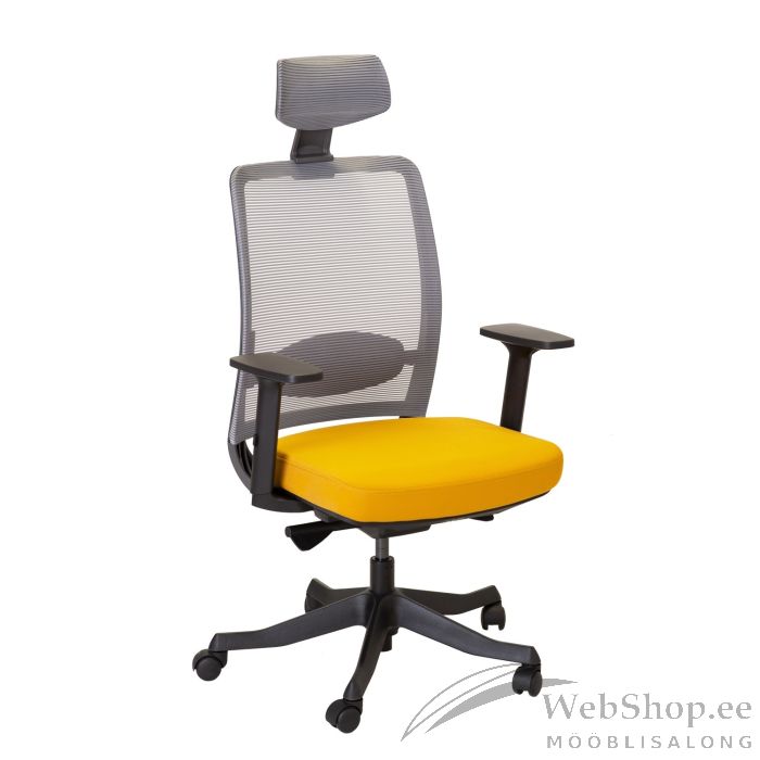 Töötool ANGGUN kollane. Iste on kaetud polüesterkangaga, 50 000 Martindale’i. Selja- ja peatugi on kaetud polüestervõrkkangaga, mis tagab hea õhu liikuvuse. Sünkroonmehhanism korrigeerib kiike jäikuse automaatselt vastavalt istuja kaalule. Reguleeritav nimmetugi. Istme sügavus on reguleeritav vahemikus 39,5-47,5cm. Istme kõrgus on reguleeritav gaasamordi abil. Käetoed on mustast plastikust. Käetugede sügavus ja pöördenurk on reguleeritavad. Käetugede kõrgus on reguleeritav vahemikus 17,5-28cm. Peatoe kõrgus on reguleeritav. 5-haruline jalarist on musta värvi plastikust, D70cm. Toolil on plastikrattad, 50mm. Tooli kõrgus on 116-130,5cm, seljatoe kõrgus 52,5cm (koos peatoega 72-76,5cm), istme kõrgus 44-54cm, istme sügavus 39,5-47,5cm, istme laius 45cm. Toote mõõdud on 70x70xH116-130,5cm. Tooli kaalupiirang on 120kg.