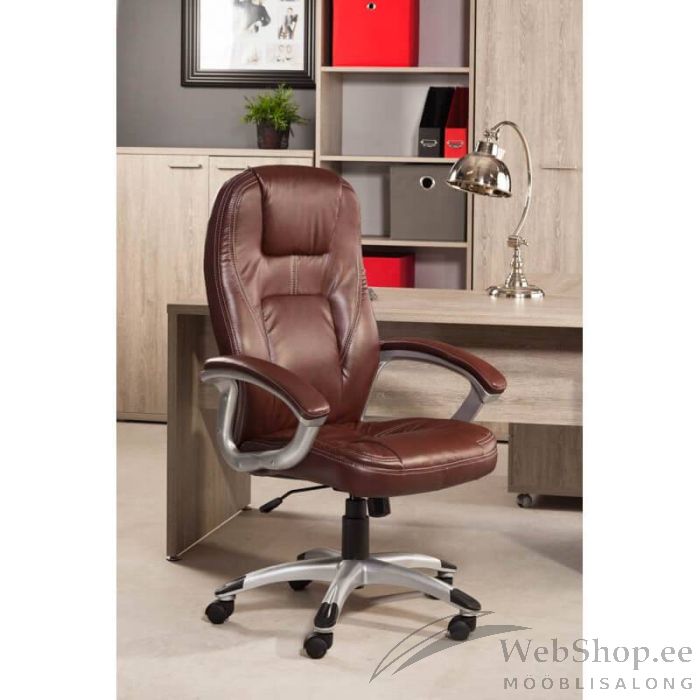 Töötooli iste ja seljatugi on kaetud pruuni kunstnahaga