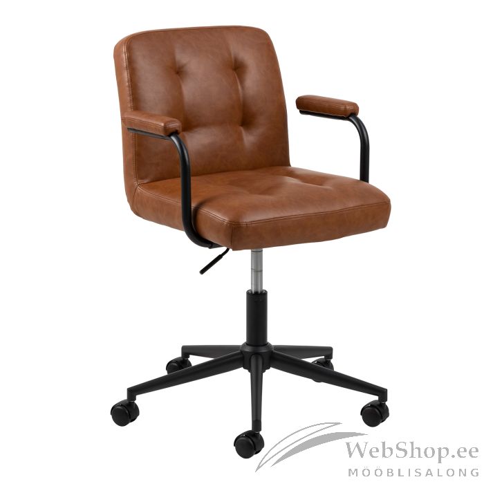 Moodne käetugedega töötool. See on mugav, praktiline ja kaasaegne. Iste ja seljatugi tagavad mugava asendi. Tool on reguleeritava kõrgusega, sellel on pöörlemis- ja kallutusfunktsioon. Pulbervärvitud alus. Mõõdud: 56x59xH88,5cm. HOOLDUS: pühkige pind seebiveega või PU (polüuretaan) pindade puhastusvahenditega, kuivatage pind. Kasutage ainult PH neutraalseid (7,0) puhastusvahendeid. Ärge asetage mööblit otsese päikesevalguse kätte. Ärge hõõruge pinda kõvade esemetega.