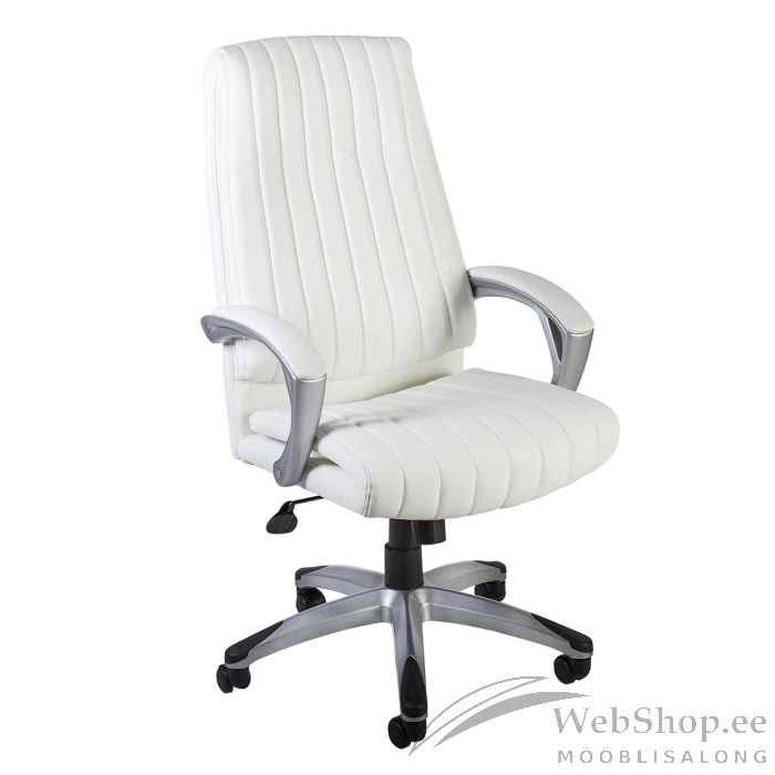 Töötool ELEGANT valge. Iste ja seljatugi on kaetud valge kunstnahaga. Tooli raami värvus on hõbedane. Toolil on sünkroonmehhanism. Kiike jäikus on reguleeritav vastavalt istuja kaalule. Istme kõrgus on reguleeritav gaasamordi abil. Plastikust käetoed on polsterdatud ja kaetud kunstnahaga. Jalarist on hõbedasest plastikust. Toolil on plastikrattad, tihvt: 11mm. Tooli kõrgus on 112-119,5cm. Toote mõõdud on 62,5x76,5xH112-119,5cm. Tooli kaalupiirang on 120kg.