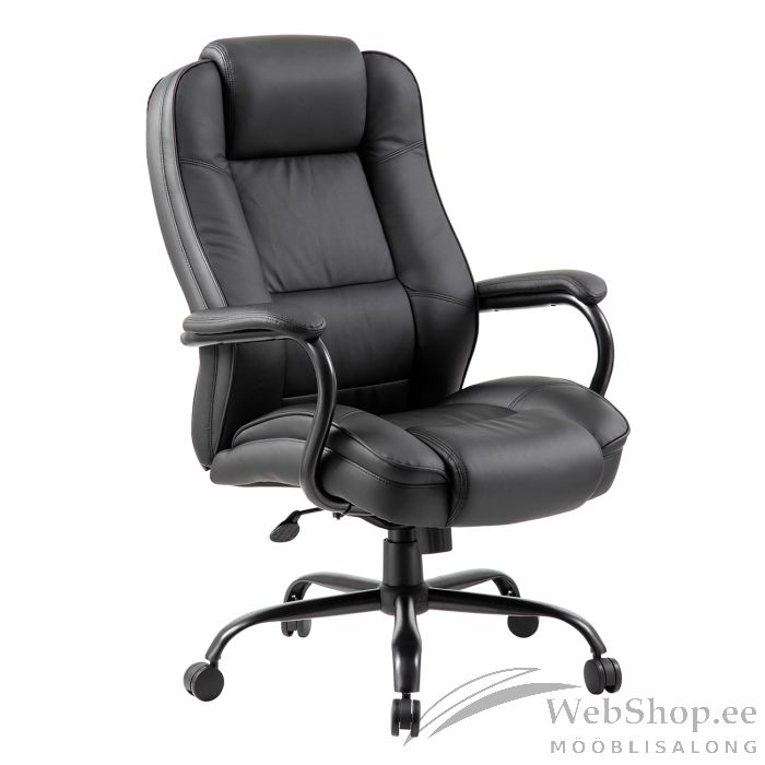 Töötool ELEGANT XXL must. Iste ja seljatugi on kaetud musta kunstnahaga. Tooli raami värvus on must. Toolil on sünkroonmehhanism. Kiike jäikus on reguleeritav vastavalt istuja kaalule. Istme kõrgus on reguleeritav gaasamordi abil. Terasest käetoed on polsterdatud ja kaetud kunstnahaga. Jalarist on musta värvi terasest, R37cm. Toolil on plastikrattad, tihvt: 11mm. Tooli kõrgus on 113-120,5cm. Toote mõõdud on 79,5x82xH113-120,5cm. Tooli kaalupiirang on 150kg.