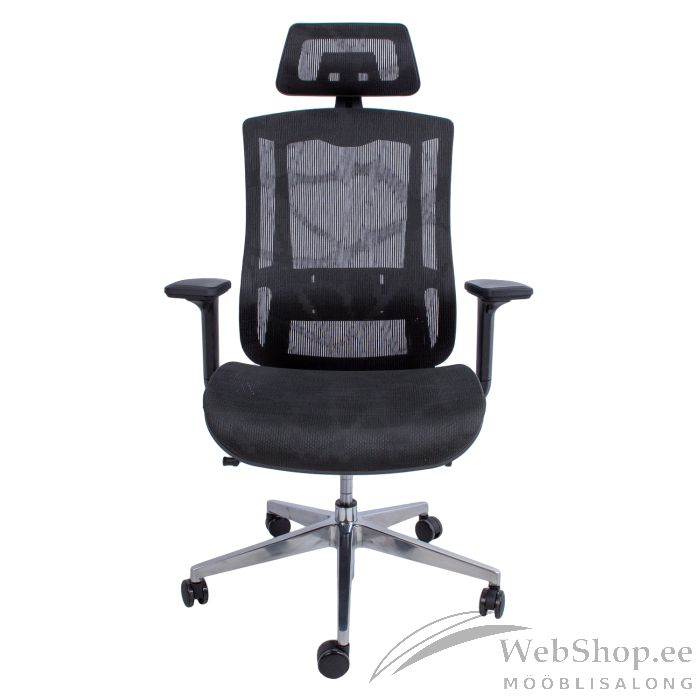 Töötool FLEX must. Ergonoomiline töötool FLEX on mugav ja vastupidav. Tool on kaetud polüestervõrkrkangaga, 50 000 Martindale’i. Toolil on multifunktsionaalne mehhanism, lukustatav neljas positsioonis. Reguleeritav nimmetugi. Istme kõrgus on reguleeritav gaasamordi abil. Mustast plastikust käetoed on pehme polüuretaankattega. Käetugede kõrgus (17-24cm), sügavus ja pöördenurk on reguleeritavad. Peatoe kõrgus ja kaldenurk on reguleeritavad. 5-haruline jalarist on poleeritud alumiiniumist, R35cm. Toolil on plastikrattad, 60mm. Tooli kõrgus on 116-126cm, istme laius 50cm, sügavus 50cm, istme kõrgus 48-57cm. Toote mõõdud on 70x70xH116-126cm. Tooli kaalupiirang on 130kg.