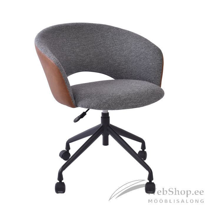 Töötool KARINA ratastega 62x60xH68-74cm, hall/helepruun. Tooli iste ja seljatugi on kergelt polsterdatud ja kaetud halli polüesterkangaga. Seljatoe väliskülg on kaetud helepruuni kunstnahaga. Tooli istme kõrgus on reguleeritav gaasamordi abil. Tooli neljaharuline plastikratastega metallist jalg on viimistletud musta pulbervärviga.