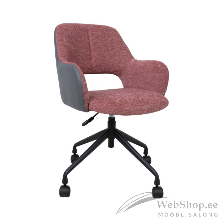 Töötool KENO ratastega 57x62xH82-88cm, tumeroosa/hall. Tooli iste ja seljatugi on kergelt polsterdatud ja kaetud tumeroosa sametise polüesterkangaga. Seljatoe väliskülg on kaetud halli kunstnahaga. Tooli istme kõrgus on reguleeritav gaasamordi abil. Tooli neljaharuline plastikratastega metallist jalg on viimistletud musta pulbervärviga.