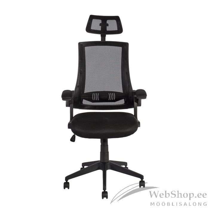 Töötool NOVARA must. Iste ja seljatugi on kaetud musta polüestervõrkkangaga. Ergonoomilise disainiga seljatoeraam on valmistatud mustast plastikust. Toolil on kiikemehhanism. Istme kõrgus on reguleeritav gaasamordi abil. Pehme polsterdusega kangaga kaetud käetugesid on võimalik üles tõsta. Peatugi on vabalt kallutatav. Toolil on must plastikust 5-haruline jalarist ja plastikrattad. Tooli kõrgus on 117,5-127,5cm. Toote mõõdud on 66x70,5xH117,5-127,5cm. Tooli kaalupiirang on 120kg.