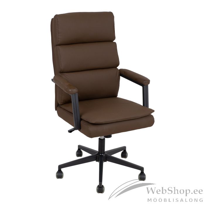 Töötool REMY pruun kunstnahk. Tooli pehme polsterdusega iste ja seljatugi on kaetud kunstnahaga. Toolil on sünkroonmehhanism. Istme kõrgus on reguleeritav gaasamordi abil. Mustad metallist käetoed on pehme polsterdusega. 5-haruline jalarist on valmistatud metallist ja viimistletud musta pulbervärviga, R32cm. Toolil on põrandat säästvad PU kattega rattad. Tooli üldmõõdud on 65x72xH108-115cm. Istme laius 50cm, istme sügavus 47cm, istme kõrgus 49-56cm. Käetugede kõrgus istmest on 20cm. Kaalupiirang 120kg.