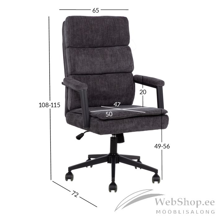 Tooli üldmõõdud: 65 x 72 x H108 - 115 cm. Istme laius 50 cm, istme sügavus 47 cm, istme kõrgus 49 - 56 cm. Käetoe kõrgus istmest on 20 cm.