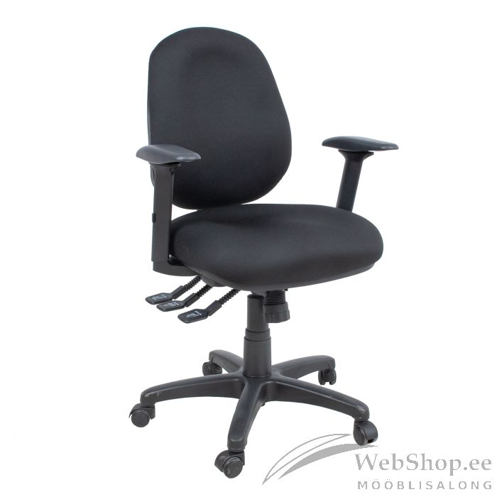 Töötool SAGA must. Ergonoomilise disainiga tool on mitmekülgselt reguleeritav. Iste on pehme polstri ja mugava vormiga. Iste on kaetud polüesterkangaga, 50 000 Martindale’i. Plastikkorpus on musta värvi. Toolil on sünkroonmehhanism, lukustatav mitmes positsioonis. Istet ja seljatuge on võimalik reguleerida sõltumatult. Seljatoe kõrgus on reguleeritav 49-56,5cm. Seljatoe kaldenurk on reguleeritav ja fikseeritav. Istme sügavus ja kaldenurk on reguleeritavad, negatiivne kalle. Istme kõrgus on reguleeritav gaasamordi abil. Terasest käetoekonstruktsioon on kaetud musta plastikkattega. Käetugedel on mugava vormiga polüuretaanist toetuspind. Käetoed on kolmes suunas reguleeritavad. Käetugede kõrgus on reguleeritav 19,5-29cm. Käetugede toetuspinda saab lükata ette-taha ja muuta pöördenurka sisse-välja. Must 5-haruline jalarist on polüpropüleenplastist, D64cm. Toolil on plastikrattad, 50mm. Tooli kõrgus on 95,5-115cm, istme kõrgus 46,5-49cm, istme sügavus 39-44cm, istme laius 44cm. Toote mõõdud on 64x64xH95,5-115cm. Tooli kaalupiirang on 120kg.