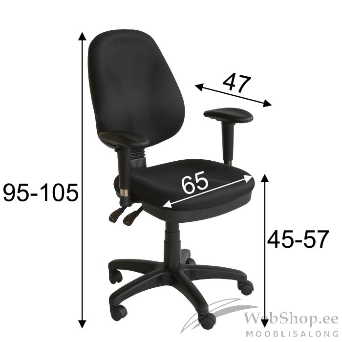 Töötool SAVONA must. Iste ja seljatugi on kaetud musta värvi polüesterkangaga, 50 000 Martindale'i. Tooli raami värvus on must. Seljatoe kõrgus ja kaldenurk on reguleeritavad. Istme kõrgus on reguleeritav gaasamordi abil. Käetoed on polüuretaanist. Käetugede kõrgus ja pöördenurk on reguleeritavad. Jalarist on musta värvi plastikust. Toolil on põrandat säästvad kummirattad, tihvt: 11mm. Tooli kõrgus on 96-106cm, istme kõrgus 43-55cm, istme sügavus 48cm, istme laius 49cm. Toote mõõdud on 65x47xH96-106cm. Tooli kaalupiirang on 120kg.