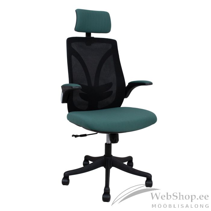 Töötool TANDY roheline/must. Tooli polsterdatud iste ja peatugi on kaetud rohelise polüesterkangaga. Seljatugi on kaetud kihilise musta polüestervõrkkangaga, nimmetugi on fikseeritud. Toolil on lukustatav kiikemehhanism. Istme kõrgus on reguleeritav gaasamordi abil. Kergelt polsterdatud kangaga kaetud käetoed on üles lükatavad. Peatoe kõrgus ja kaldenurk on reguleeritavad. 5-haruline jalarist on mustast plastikust, R33cm. Toolil on plastikrattad 50mm. Tooli üldmõõdud on 62,5x64xH116-126cm. Istme laius 53cm, istme sügavus 52cm, istme kõrgus 45-55cm. Kaalupiirang 120kg.