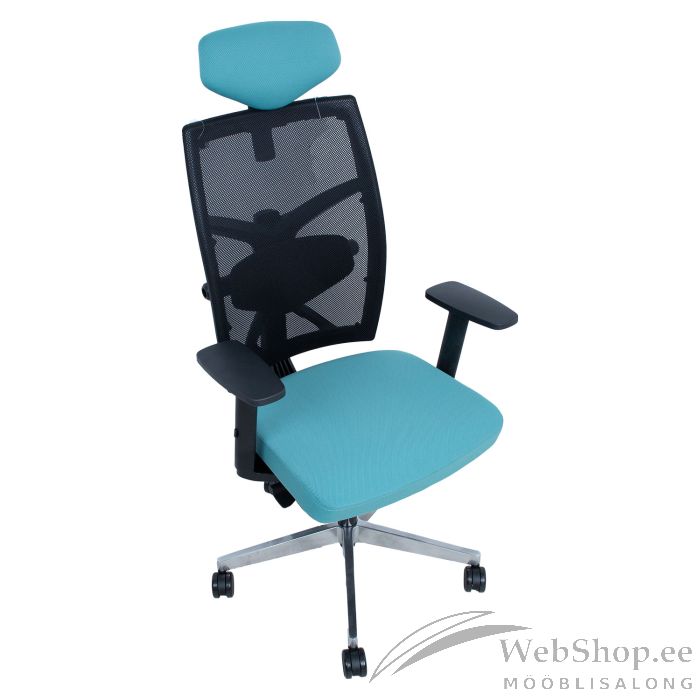 Töötool TUNE sinakasroheline/must. Iste on kaetud polüesterkangaga, 50 000 Martindale’i. Seljatugi on kaetud polüestervõrkkangaga. Tooli plastikkorpus on musta värvi. Toolil on kiikemehhanism, lukustamine mitmes positsioonis ja automaatne kiike jäikuse reguleerimine. Seljatoe kõrgus on reguleeritav vahemikus 50-60,5cm, istme sügavus vahemikus 44-48cm. Istme kõrgus on reguleeritav gaasamordi abil. Reguleeritav nimmetugi. Mustad plastikust käetoed on kolmes suunas reguleeritavad. Käetugede kõrgus on reguleeritav vahemikus 20,5-30,5cm. Käetugede toetuspinda saab lükata ette-taha ja muuta pöördenurka sisse-välja. Peatugi on vabalt kallutatav 30°, peatoe kõrgus reguleeritav. Toolil on alumiiniumist 5-haruline jalarist, D70cm. Toolil on põrandat säästvad piduritega rattad, 65mm. Tooli üldmõõdud on 70x70xH111-128cm. Tooli kõrgus on 111-128cm, istme kõrgus 41,5-51,5cm, istme sügavus 44-48cm, istme laius 49cm. Kaalupiirang 120kg.