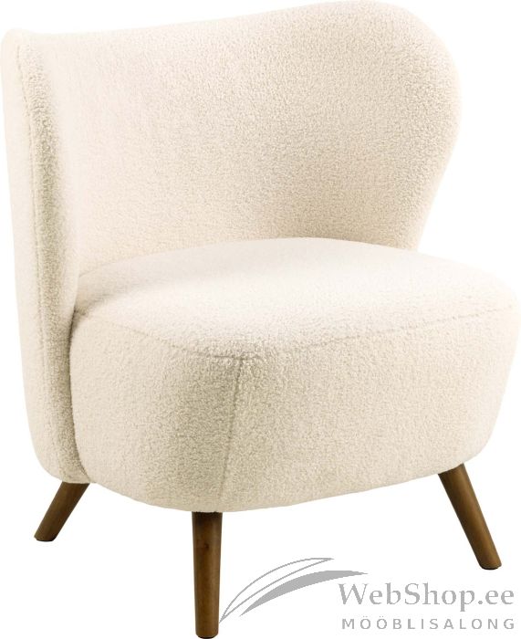 Soe ja kutsuv puhketool aitab nautida hubaseid hetki. Tooli kumer disain on kombineeritud pehme kreemika kangaga. Kitsenevad puitjalad toovad ülejäänud disaini tasakaalustatud kontrasti. Tool sobib suurepäraselt lugemisnurka või elutuppa aktsendi lisamiseks. Mõõdud on 76x73xH82cm.