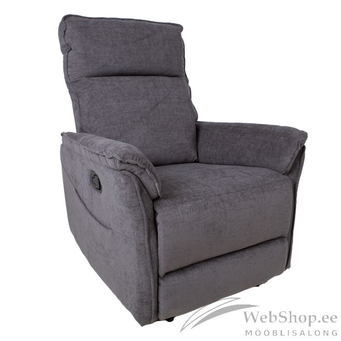 Tugitool GERRY manuaalne recliner 76x92xH101cm, hall. Recliner tüüpi tugitooli jalatoe asendit on võimalik muuta manuaalse mehhanismi abil. Jalatoe tõstmiseks tõmmake tooli paremal välisküljel asuv kang üles. Surudes jalatuge alla fikseerub see automaatselt algasendisse. Kattematerjal: 100% polüesterkangas, Martindale 15 000. Karkass ja vedrustus: vineer, metall. Pocket vedrud. Polsterdus: polüuretaanvaht, polüesterkiud. Tooli üldmõõdud on 76x92xH101cm. Istme laius 46cm, istme sügavus 52cm, istme kõrgus 46cm. Seljatoe kõrgus 65cm. Käetoe kõrgus maast 62cm.