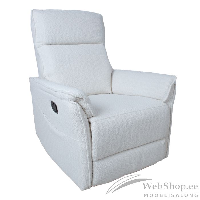 Tugitool GERRY manuaalne recliner 76x92xH101cm, valge. Recliner tüüpi tugitooli jalatoe asendit on võimalik muuta manuaalse mehhanismi abil. Jalatoe tõstmiseks tõmmake tooli paremal välisküljel asuv kang üles. Surudes jalatuge alla fikseerub see automaatselt algasendisse. Kattematerjal: 100% polüesterkangas, Martindale 15 000. Karkass ja vedrustus: vineer, metall. Pocket vedrud. Polsterdus: polüuretaanvaht, polüesterkiud. Tooli üldmõõdud on 76x92xH101cm. Istme laius 46cm, istme sügavus 52cm, istme kõrgus 46cm. Seljatoe kõrgus 65cm. Käetoe kõrgus maast 62cm.