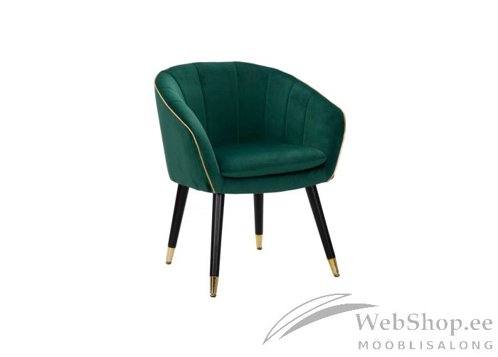 Stiilne rohelist värvi velvetist kattega tugitool. Tooli jalad on kuldset tooni metallist ja musta tooni puidust. Tooli pehmenduseks poroloon.