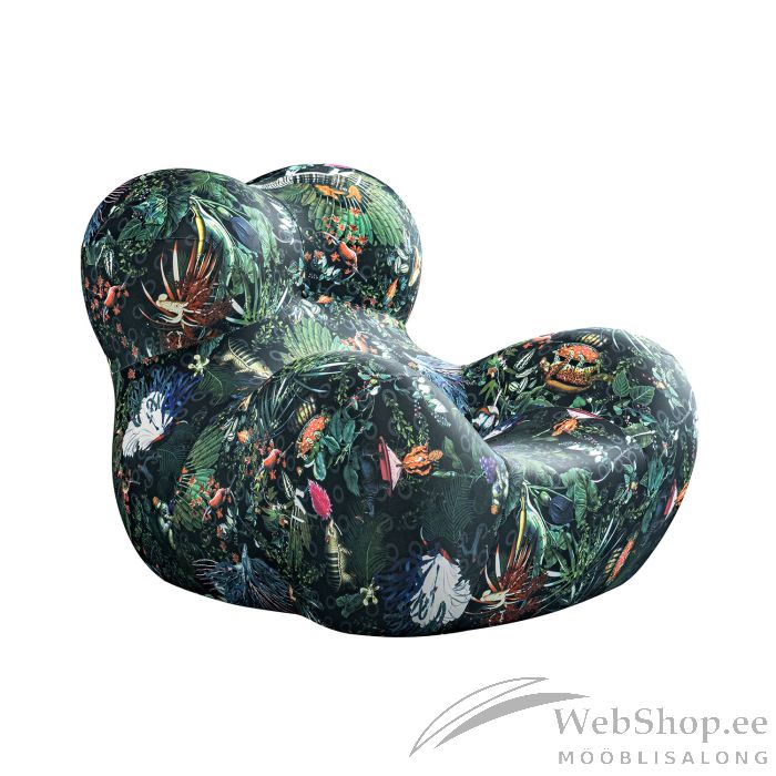 See efektne tugitool ühendab skulpturaalse vormi ja rikkaliku, loodusest inspireeritud mustri. Sügavad rohelised toonid, detailirohked taime- ja loomamotiivid loovad justkui eksootilise džunglimaailma, mis muudab iga ruumi elavaks ja meeldejäävaks.