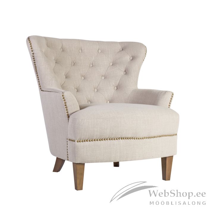 Tugitool HOLMES 79x85xH98cm, beeþ. Tugitool on kaetud beeþi linase välimusega kangaga. Kattematerjal on 57,7% polüester, 25,7% viskoos, 16,6% linane kangas. Polsterdus: polüuretaanvaht. Tugitoolil on puidust jalad. Toote mõõdud on 79x85xH98cm.